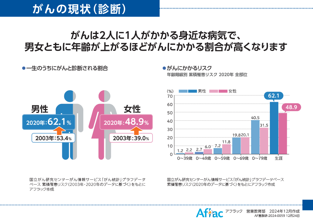 一生のうちにガンになる確率は2人に1人と言われています。そして年齢を重ねるほどガンにかる確率は高くなります。早期発見のために定期的なガン検診の受信が非常に需要です。